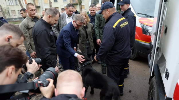 Міністр показав фінській делегації службових собак, які того дня допомагали шукати людей під завалами будинку у Святошинському районі столиці, у тому числі німецьку вівчарку, на ім'я Зеніт, яка врятувала чоловіка, котрий більше ніж шість годин перебував під завалами.