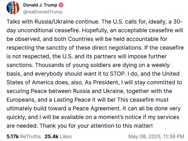 Президент Сполучених Штатів Дональд Трамп після розмови з президентом України 8 травня заявив, що в найкращому варіанті хотів би 30-денного безумовного перемир’я та знову згадав про можливість нових санкцій проти Росії.