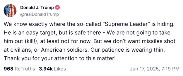 У серії дописів на Truth Social Трамп заявив, що США мають "повний і тотальний контроль над повітряним простором Ірану" і знають місцеперебування іранського верховного лідера.