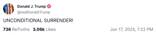 Зрештою Трамп зажадав від Ірану "БЕЗУМОВНОЇ КАПІТУЛЯЦІЇ!" (авторська орфографія збережена. – Ред.).