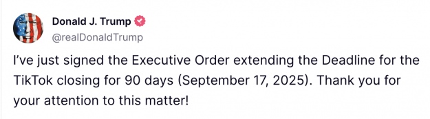 Американський президент зазначив, що підписав указ "про продовження терміну закриття TikTok на 90 днів" – до 17 вересня 2025 року.