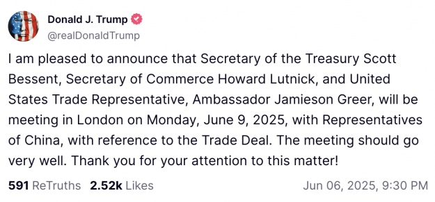 За словами президента США, переговори щодо двосторонньої торгівлі з Китаєм мають відбутись у Лондоні в понеділок, 9 червня.
