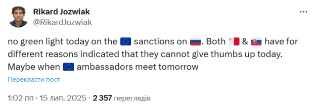 За словами співрозмовників, у вівторок посли ЄС вже не погодять 18-й пакет санкцій проти Росії, оскільки Словаччина і Мальта досі не готові голосувати "за".