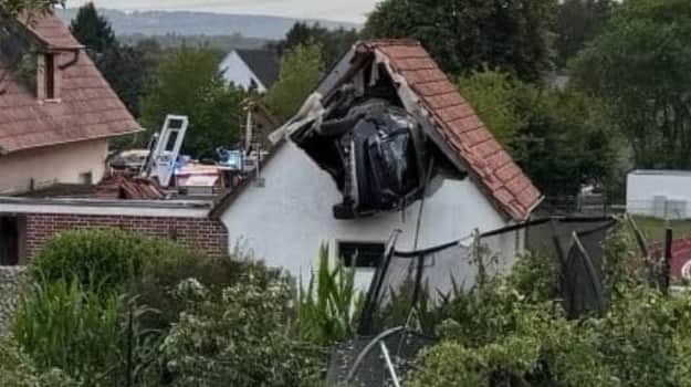 У суботу ввечері у спокійному житловому районі в містечку Бомте, що в німецькій Нижній Саксонії, сталася драматична аварія, внаслідок якої автомобіль застряг під дахом будинку.