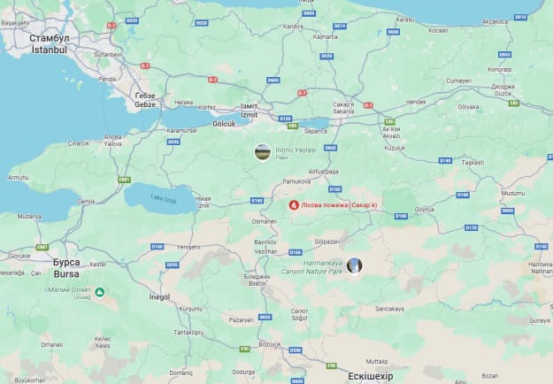 Пожежа спалахнула в понеділок у районах Гейве і Хендек та поширилася у напрямку Беледжика. Ще дві пожежі вирують в районі міст Ескішехір та Карабюк.