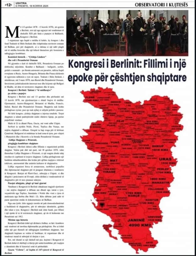Стаття супроводжувалася картою, на якій деякі території Греції, зокрема історичні області Корфу, Епір та Гревена, позначені як "історичні албанські території". У матеріалі Берлінський конгрес 1878 року називають "історичною несправедливістю" щодо албанців.