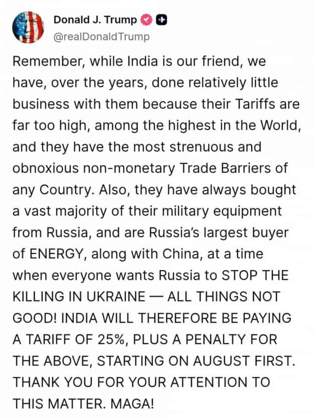 "Поэтому Индия будет платить пошлину в размере 25%, а также штраф за вышеуказанное, начиная с 1 августа", – резюмировал президент США.