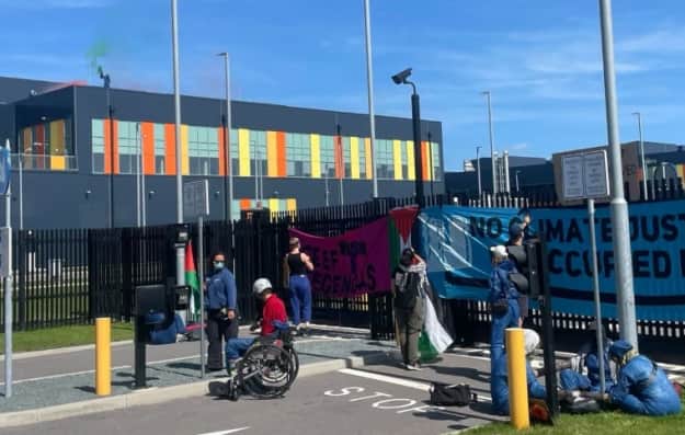 На кадрах, опублікованих у соціальних мережах, видно, як деякі активісти в неділю блокували доступ до великого об'єкта Microsoft на північному заході країни. Один із них піднявся на дах будівлі і запалив фаєр.