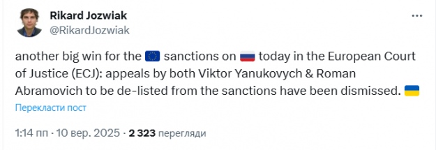 "Велика перемога для європейських санкцій проти Росії сьогодні у Суді ЄС: апеляції і Віктора Януковича, і Романа Абрамовича щодо виключення із санкційних списків – відхилено", – написав Джозвяк.