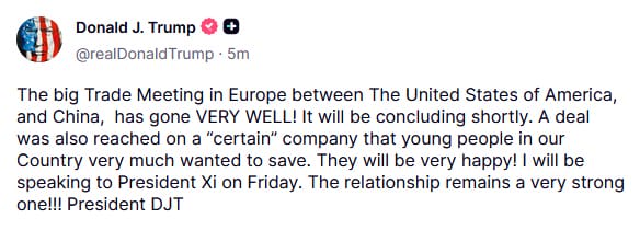 "Також досягнуто угоди щодо певної компанії, яку молодь з нашої країни дуже хотіла би врятувати. Вони будуть дуже щасливі! Я говоритиму з президентом Сі у п’ятницю. Наші відносини залишаються дуже сильними", – написав Трамп.
