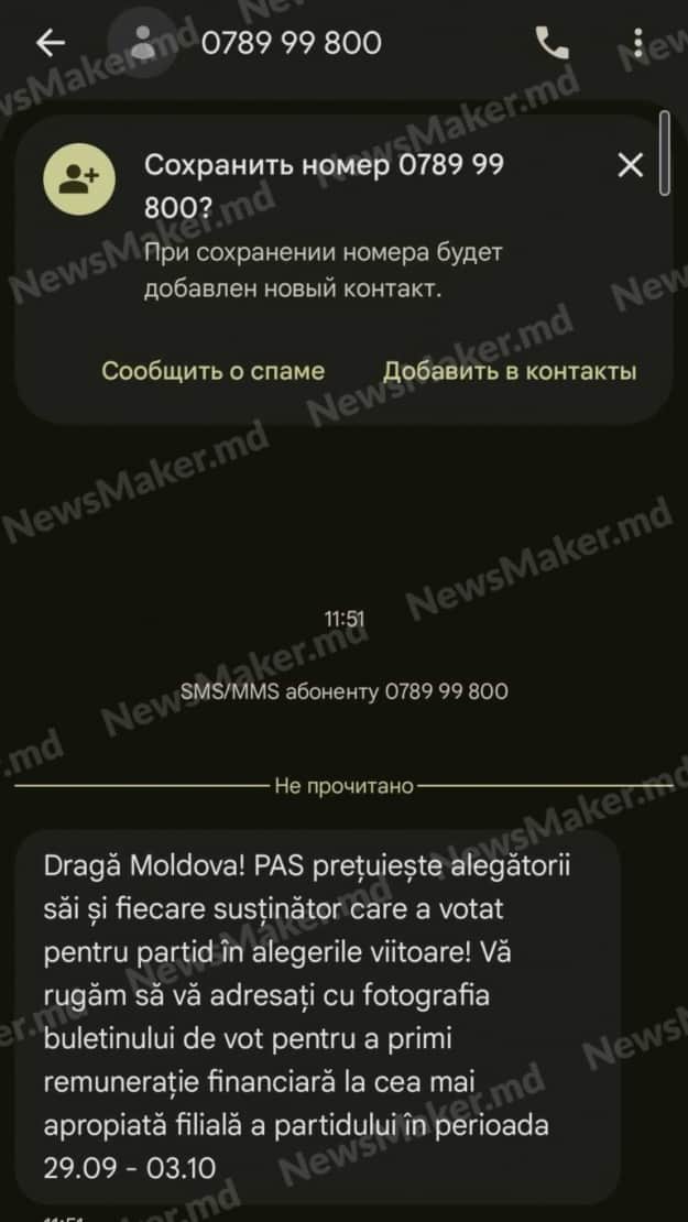 "Дорога Молдова! PAS цінує своїх виборців і кожного прихильника, який проголосує за партію на майбутніх виборах. Просимо вас надіслати фотографію посвідчення особи, щоб ви отримали грошову винагороду біля найближчої філії партії з 29.09 до 03.10", – йдеться в повідомленні.