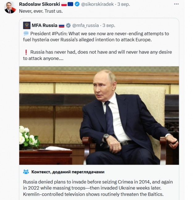 3 вересня Міністерство закордонних справ Росії розмістило у своєму X цитату очільника Кремля Владіміра Путіна про "спроби роздувати істерію" з приводу того, що Росія планує напасти на Європу, а Росія "ніколи не мала, не має і не матиме жодного бажання на когось нападати".