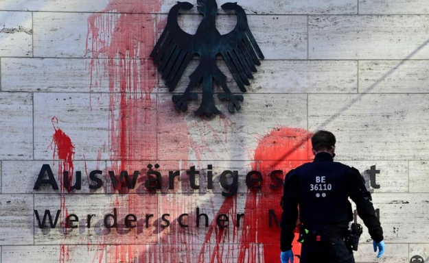 Акція, вочевидь, була політично мотивованою: після ймовірного пропалестинського нападу з використанням фарби на Міністерство закордонних справ у Берліні поліція повідомила про п'ять арештів.