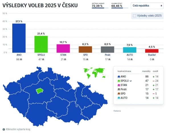 За результатами підрахунку понад 70% голосів на парламентських виборах у Чехії популістська партія експрем’єра Андрія Бабіша ANO лідирує зі значним відривом.