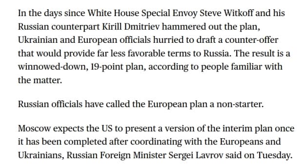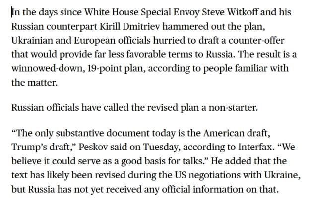 Також у матеріалі містилась цитата речника Кремля Дмитрія Пєскова, який заявив, що "єдиним суттєвим документом на сьогодні є американський проєкт, проєкт Трампа". У подальшій цитаті Пєсков стверджував, що РФ вважає це "план Трампа" хорошою основою для переговорів.