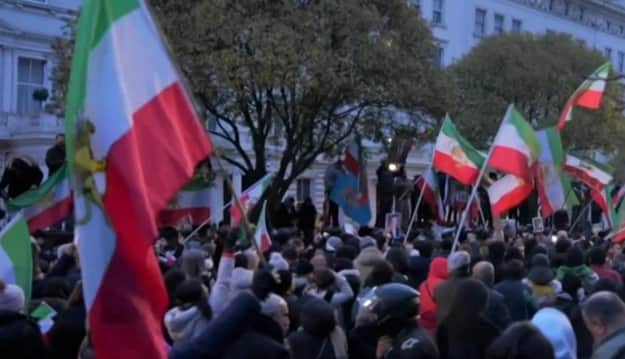 Демонстранти зібралися біля посольства в Лондоні, розмахували прапорами та вигукували антиурядові гасла. Кадри з місця подій, оприлюднені в суботу, зафіксували чоловіка, який виліз на будівлю посольства та зірвав з неї іранський прапор.