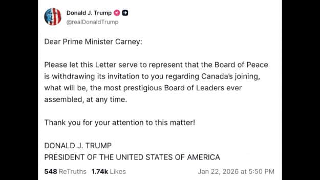 "Прошу вважати цей лист офіційним повідомленням про те, що Рада миру відкликає своє запрошення щодо приєднання Канади", – написав Трамп у дописі, адресованому канадському прем'єр-міністру Марку Карні.