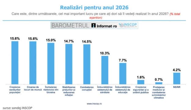 Респондентів запитали, що вони найбільше хотіли б побачити у 2026 році. По 15,6% вказали збільшення доходів та створення робочих місць, а 15% – завершення російсько-української війни.