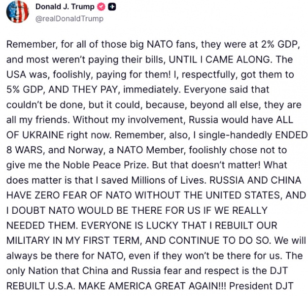 "Без моєї участі Росія зараз би вже контролювала всю Україну. Також пам’ятайте, що я одноосібно завершив вісім воєн, а Норвегія, яка є членом НАТО, по-дурному вирішила не давати мені Нобелівську премію миру. Але це не має значення. Має значення, що я врятував мільйони життів. Росія і Китай мають нуль страху перед НАТО без США – і я сумніваюся, що НАТО прийшов би нам на допомогу, коли б нам це справді було потрібно", – заявив Трамп, "забувши" про участь союзників НАТО в операції в Афганістані після терактів 2001 року.