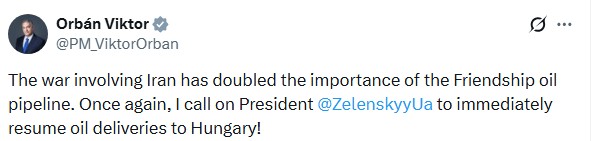 "Війна за участі Ірану подвоїла важливість нафтопроводу "Дружба". Ще раз закликаю президента Зеленського негайно відновити постачання нафти до Угорщини", – заявив Віктор Орбан.