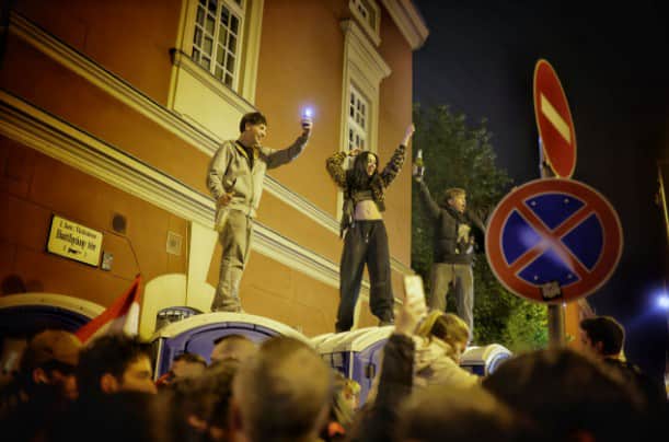 Після того, коли перші підрахунки результатів голосування не залишили сумнівів щодо абсолютної перемоги опозиційної "Тиси", тисячі людей влаштували святкування на вулицях Будапешта.