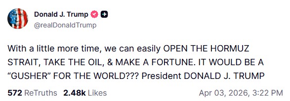 "Ще трохи часу – і ми зможемо легко відкрити Ормузьку протоку, взяти нафту і заробляти", – написав він.