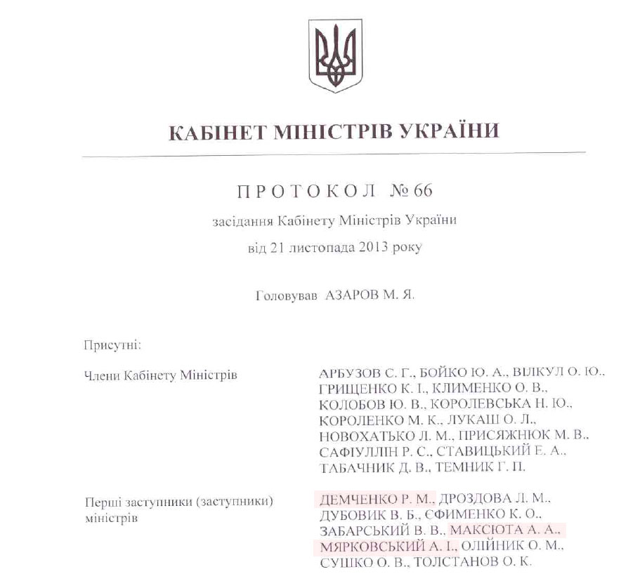 Стенограмму заседания правительства (где записаны высказывания всех министров) в КМ не предоставили, объяснив, что это документ с ограниченным доступом. Но в распоряжении ЕвроПравды оказался протокол заседания правительства. В шапке документа действительно указано, что в заседании 21.11.2013 принимал участие Руслан Демченко.
