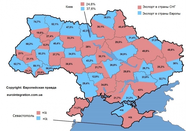 Теперь доля экспорта в ЕС превышает долю рынков СНГ уже в 15 областях, а также в Киеве.