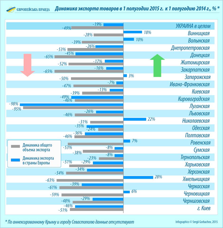 Прежде всего, нынешние статистические данные имеют очень высокую базу сравнения. В первой половине 2014 года после вступления в силу автономных преференций ЕС произошел резкий рост экспорта в ЕС – за полугодие темпы роста почти достигли 15%. Но начало широкомасштабных боевых действий на Востоке полностью нивелировало это достижение.