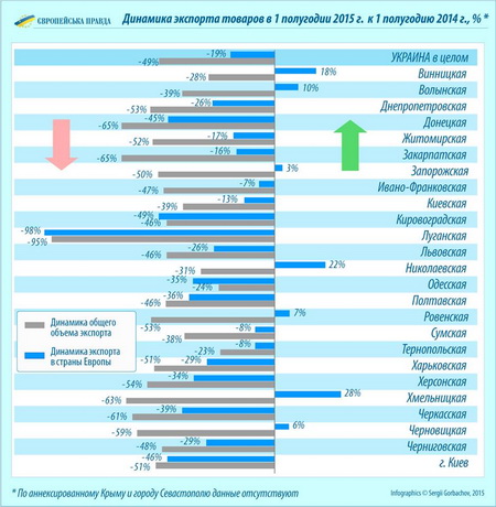 Действительно, наибольшие темпы падения экспорта в Европу фиксируются в Донецкой (-45%) и Луганской (-98%) областях.