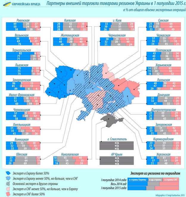 Зато количество областей, где доля торговли с европейскими странами превышает экспорт в СНГ, за полгода выросло с 5 до 18. При этом в семи западноукраинских областях доля европейского экспорта уже превышает 50% (полгода назад таких областей было всего 5).