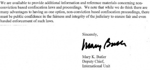 Ми готові надати додаткову інформацію та відповідні матеріали щодо законів та процедур конфіскації без винесення вироку. Ми зазначаємо: хоча ми вважаємо, що система конфіскації без винесення вироку має чимало переваг, але повинне бути суспільне переконання у справедливості і доброчесності судової влади, з тим щоб забезпечити справедливе і неупереджене виконання цього законодавства.