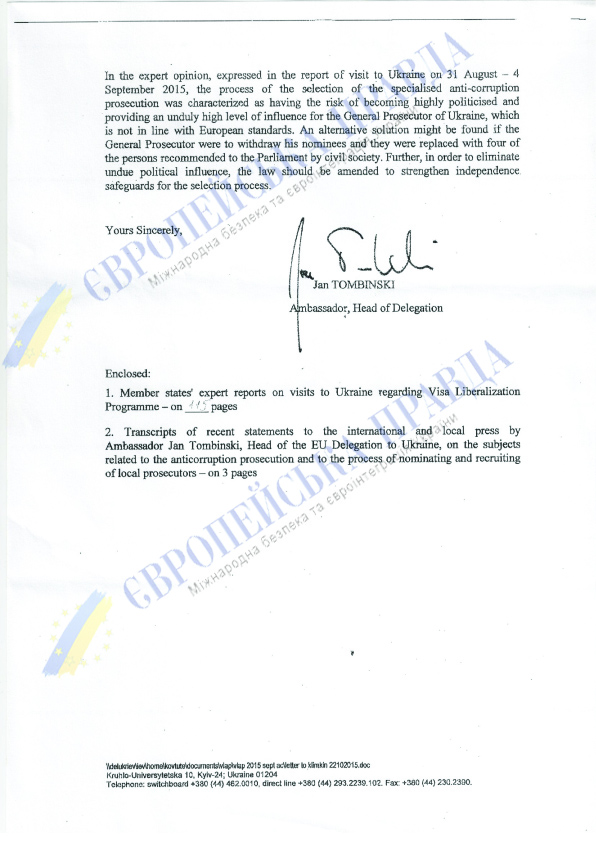 Скажете, что формулировки весьма дипломатические? Это так. Но у нас есть и другой документ – не публичный, но официальный, за подписью посла ЕС Яна Томбинского. В нем все звучит гораздо откровеннее.