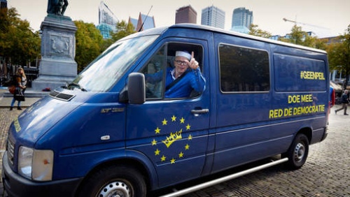 | Один из лидеров Geen Peil Ян Роос. Надпись на авто: "Помоги нам. Спаси демократию". Фото NU.nl. |