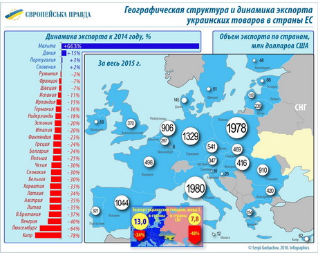 Анализируя динамику роста/падения украинского экспорта в ЕС в 2015 году, мы увидели интересную закономерность. Страны, показавшие по итогам прошлого года восстановление украинского экспорта или наименьший спад, были в "белом списке" от ЕвроПравды - украинские дипломаты в этих странах были готовы оперативно и полно предоставить отечественному бизнесу всю необходимую информацию.