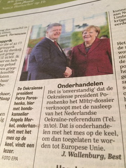 Несколько менее массовое, но от того не менее авторитетное издание Trouw вспомнило об инциденте в разделе новости, в статье, посвященной прогрессе брюссельских переговоров Рютте, изложив сухие факты, какими они являются в понимании редакции: Рютте отверг связь между МН17 и Соглашением об ассоциации; Порошенко заявил, что соглашение должно быть ратифицировано, потому что Украина отдала Нидерландам право проводить расследование по МН17; Рютте назвал эти слова украинского президента глупостью и отметил, что вопрос соглашения и МН17 путать не стоит.