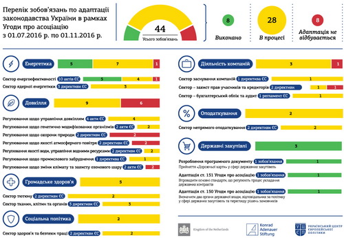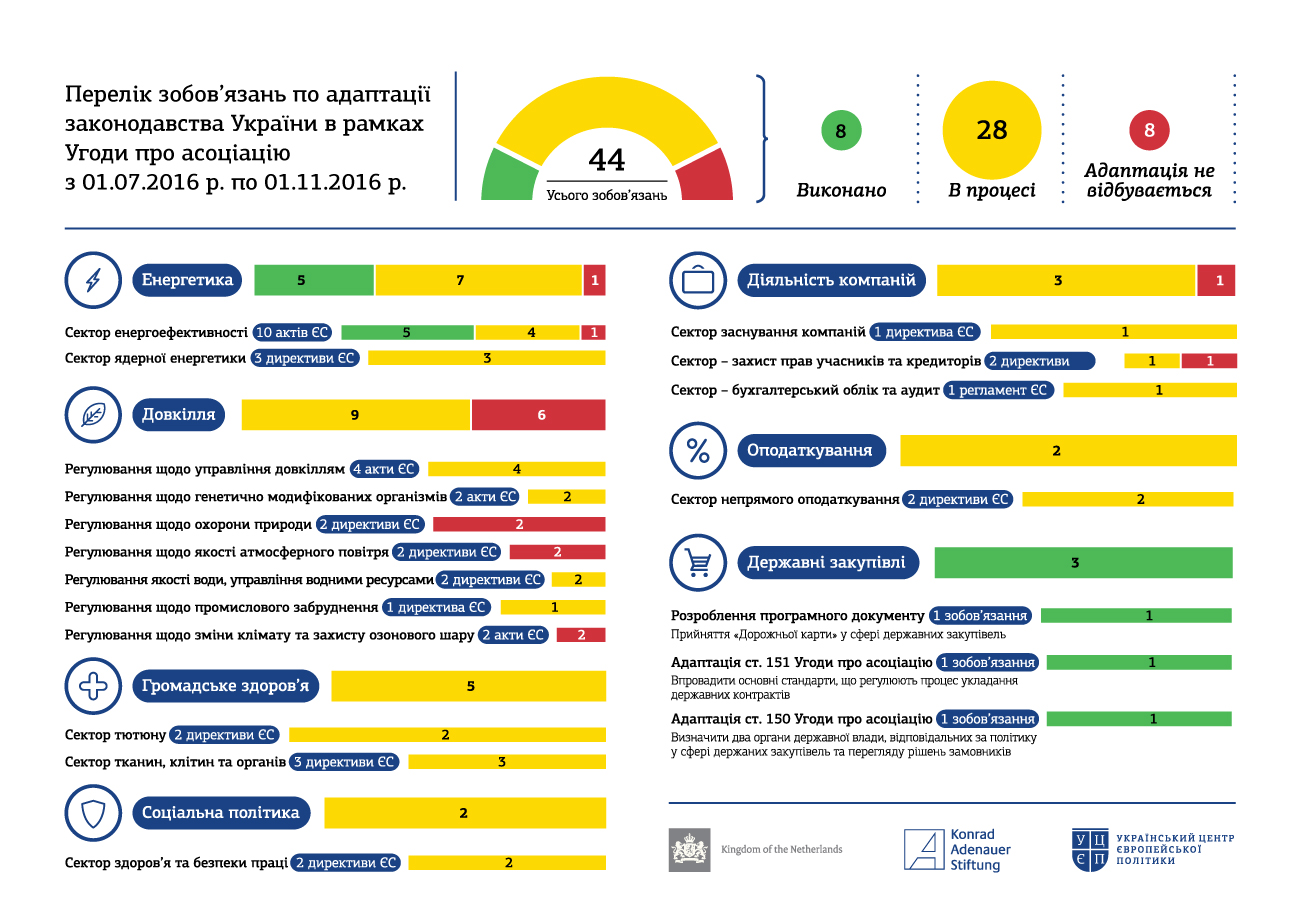 Так, за період з 1 липня 2016 року по 1 листопада 2016 року Україна мала адаптувати законодавство з 44 зобов’язаннями, з яких виконаними (адаптованими згідно вимог європейського законодавства) можна назвати лише 8. Найбільша кількість зобов’язань припала на сектори енергетики - 13 та захисту довкілля - 15.