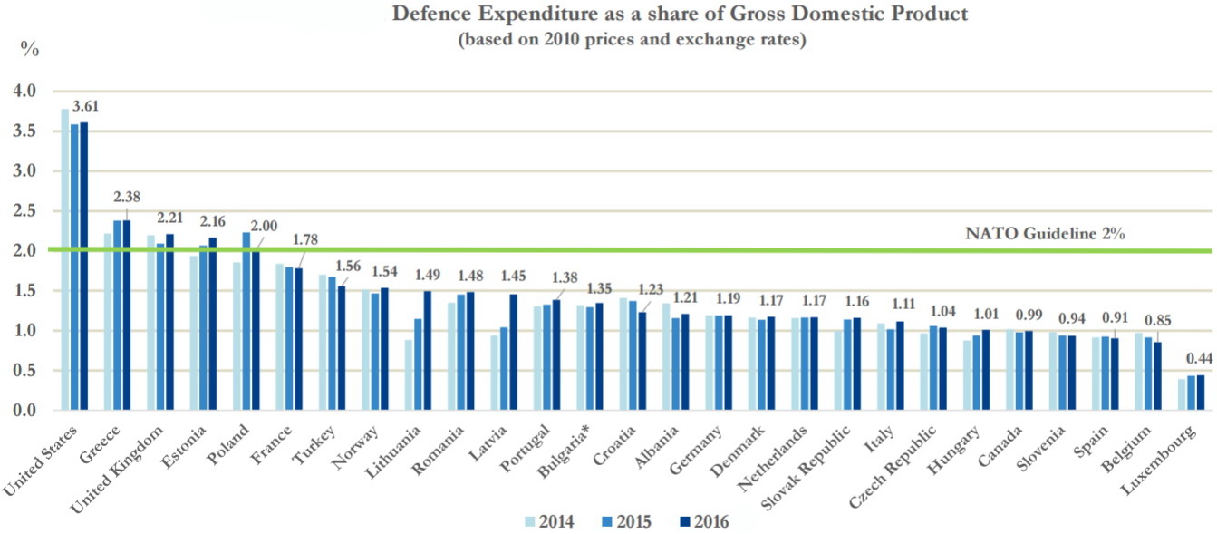 В Альянсе с давних пор действует правило, по которому оборонный бюджет каждой страны-члена должен быть не ниже 2% ее ВВП. Но (с не менее давних пор) почти все союзники игнорируют этот принцип.