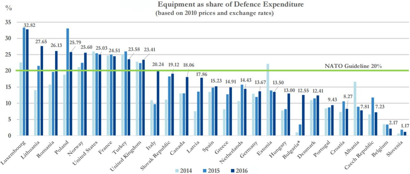 По инициативе США Альянс вспомнил еще об одном бюджетном условии, которое в последние годы оставалось на периферии внимания. В НАТО действует старая норма о том, что не менее 20% бюджета должно идти на закупку военного оснащения.