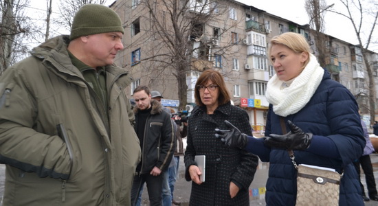 | Ребекка Хармс (в центре) входит в число евродепутатов, системно поддерживающих Украину. Фото сделано в Авдеевке 20 февраля 2017 года |