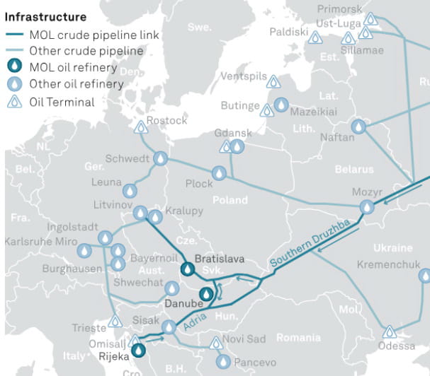 Така залежність багато років пояснювалася історичними й географічними обставинами: відсутністю прямого виходу до моря та тим, що два ключових НПЗ компанії MOL – у Сазхаломбатті (Угорщина) та Братиславі (Словаччина) – спроєктовані саме під російську нафту ще за часів СРСР.