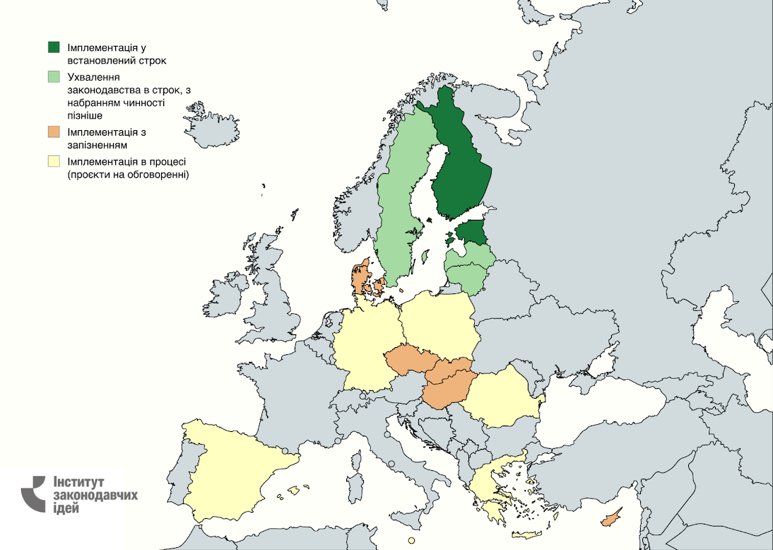 Однак, як показало дослідження Аналітичного центру "Інститут законодавчих ідей", на практиці процес транспозиції виявився значно складнішим, ніж очікувалося: лише дві країни з 27 виконали зобов’язання повністю й вчасно, а проти 18 держав-членів розпочато процедури про порушення.