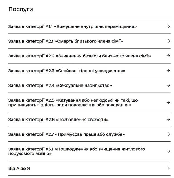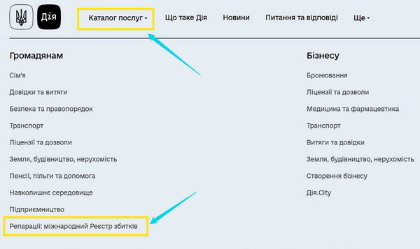 У меню оберіть "Каталог послуг" ⇒ "Громадянам" ⇒ "Репарації: Міжнародний реєстр збитків".