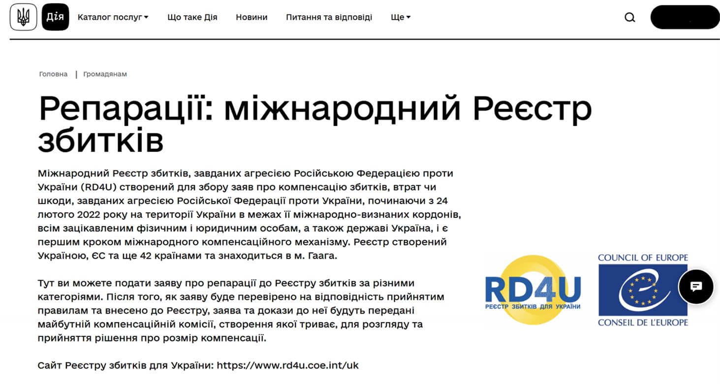 Актуальну та перевірену інформацію про категорії заяв, процедуру подання та роботу Реєстру можна знайти на офіційному сайті www.RD4U.claims