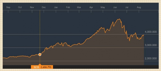 Своего пика в размере 5121 пункта Композитный индекс Шанхайской фондовой биржи достиг 11 июня. Затем последовал "обвал", и 8 июля индекс был уже на уровне 3507 пунктов. Затем он скачкообразно восстановился до 3965 пунктов 14 августа.