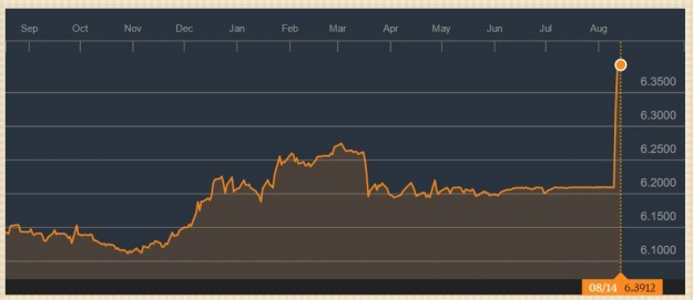 На валютном рынке приключения начались 10 августа. Курс доллара к юаню за период с 10 по 14 августа вырос с 6,2097 до 6,3912, или на 2,92%.