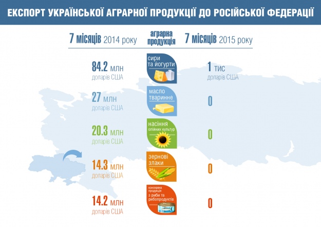 За первые 7 месяцев 2015 года показатели украинского экспорта по некоторым товарным позициям равны нулю. Если за 7 месяцев 2014 года Украина экспортировала сыров и йогуртов в РФ на общую сумму 84,2 млн долларов США, то за соответствующий период 2015 года – на сумму около 1 тыс. долларов США. Экспорт животного масла, зерновых, семян масличных культур, готовой консервной продукции из рыбы и рыбопродуктов за 7 месяцев 2015 года в Российскую Федерацию не осуществлялся.