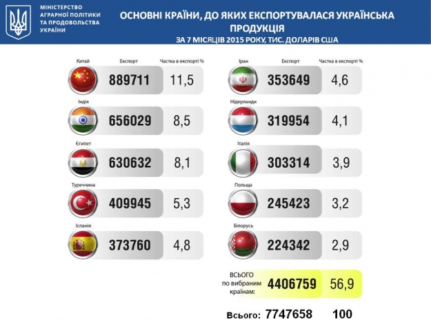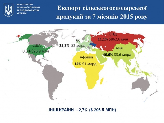 В частности, экспорт аграрной продукции составляет $7,7 млрд, или 35,7% от общего экспорта Украины, а импорт – $2,2 млрд, или 10,5% от общего импорта страны.