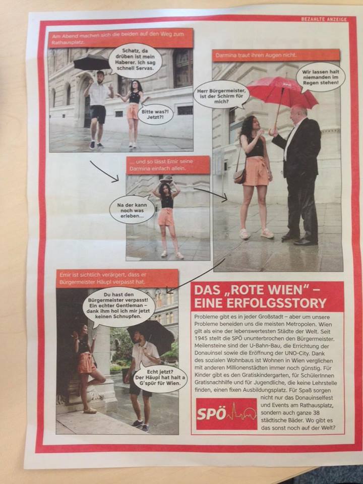 В одной из газет было размещено рекламное объявление, предлагающее в аренду помещение с адресом штаб-квартиры NEOS в связи с "провалившимся стартапом" и номером телефона главы партии Матиаса Штрольца. А социал-демократы порадовали публику "креативом" в виде лав-стори в картинках с Хойплем и парочкой эмигрантов в главных ролях, опубликованной в журнале "Бибер".