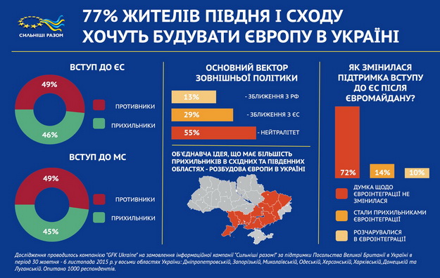 Идея евроинтеграции может стать объединяющей, ведь 77% опрошенных согласно исследованию "GfK Ukraine" поддерживают идею "Построения Европы в Украине". Сейчас очень благоприятный момент, чтобы популяризировать европеизацию Украины по европейскому образцу – люди это примут, но начинать надо с самых простых сфер, которые их волнуют – образование, медицина, ЖЭКи.